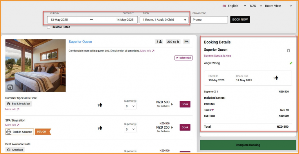 - Room/Date Unavailable: Message prompts a new search; previous search dates auto-filled