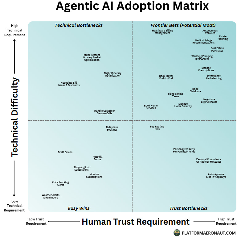 🔮 Frontier Bets (High Trust, High Technical) are the key unlocks everybody talks about when it comes to Agentic AI. I want a personal AI agent that books my travel, or plans a wedding, or manages my healthcare and estate. It’s both technically complex and requires a high degree of trust. Unlocking this quadrant for companies is the key to building multi-trillion dollar businesses as it will be the place where competitive moats are built with large applicability to the global population.