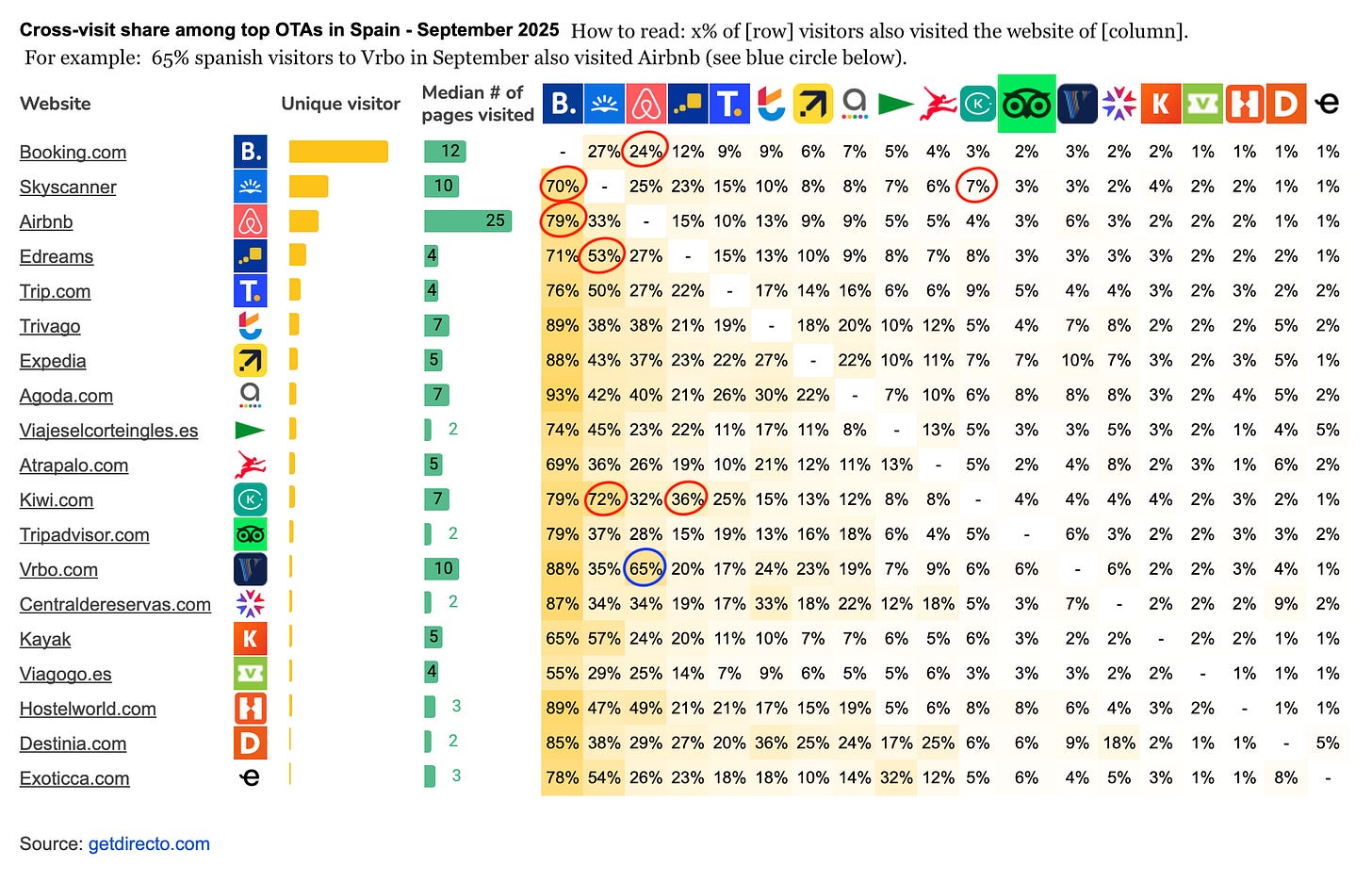 eDreams and Skyscanner are the only major players where fewer than 75% of users also visited Booking.com. Still high, at 71% and 70%, but lower than others.
