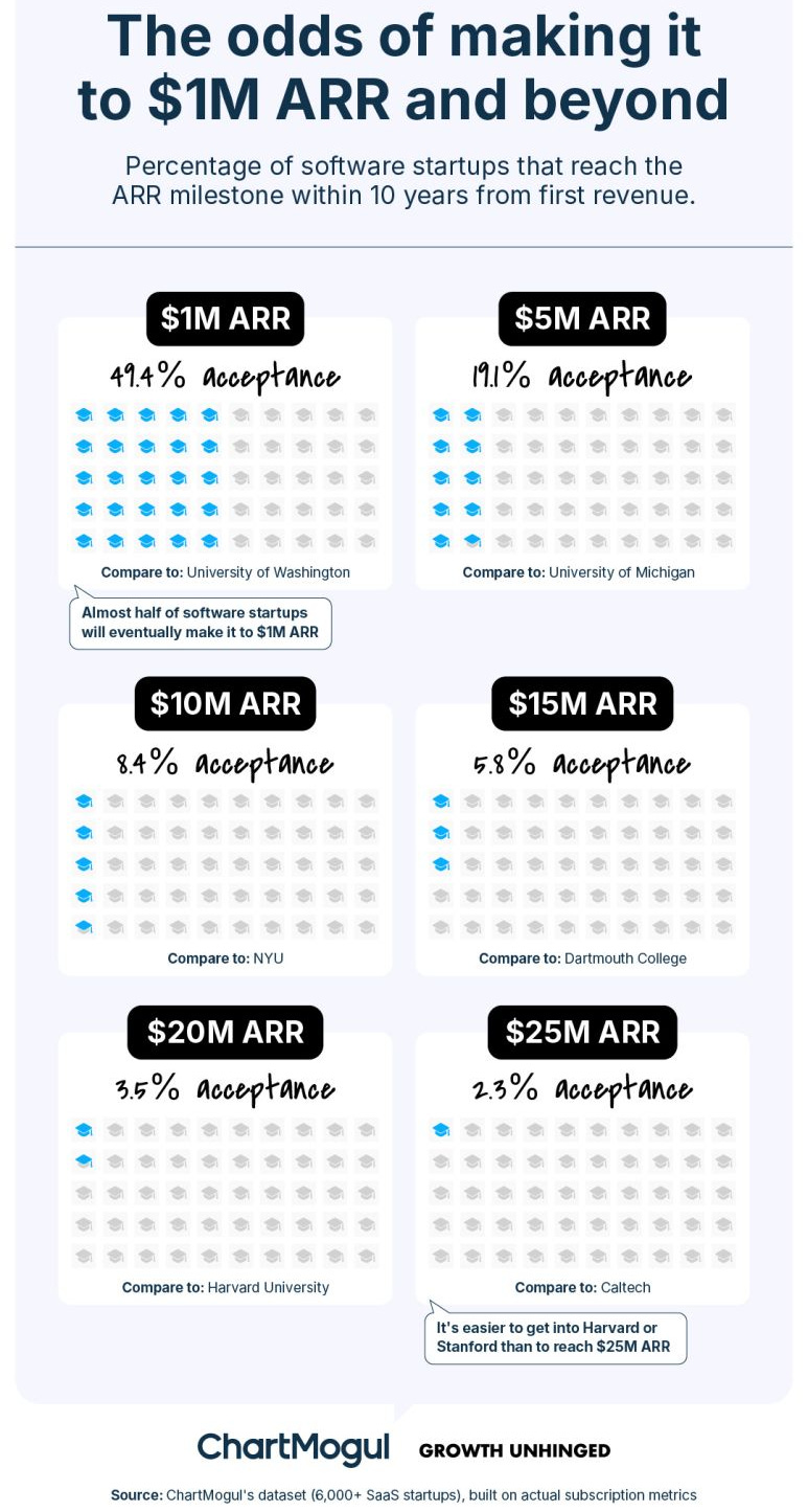 Kyle Poyar teamed up with ChartMogul to analyze growth data from 6,500+ SaaS companies. Just 2% of these startups reach $25 million in ARR within 10 years. Even hitting $1 million ARR takes longer than most founders might expect: 2 to 5 years after monetization. Only 3% get there in under a year.