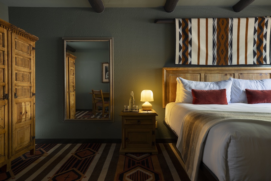 Throughout the guestrooms and suites, the design preserves the property’s original architectural character with black vigas—a hallmark of Southwestern-style design—and rough-hewn ceiling beams. These historic elements are paired with modern Southwestern rugs and preserved pine furniture.