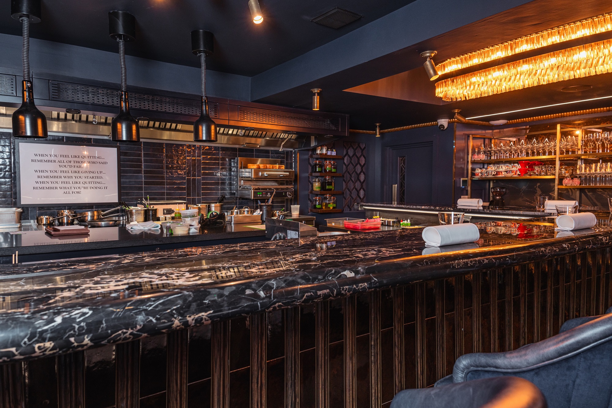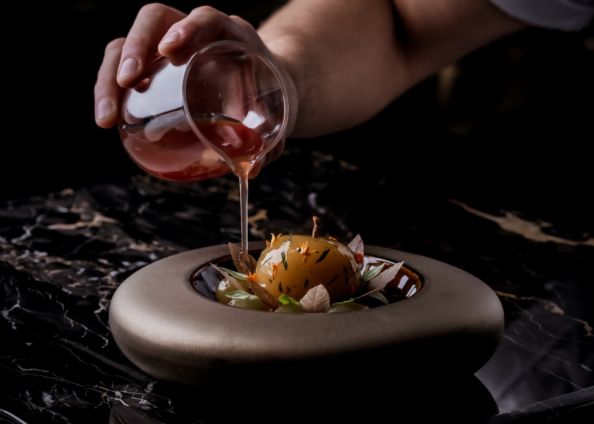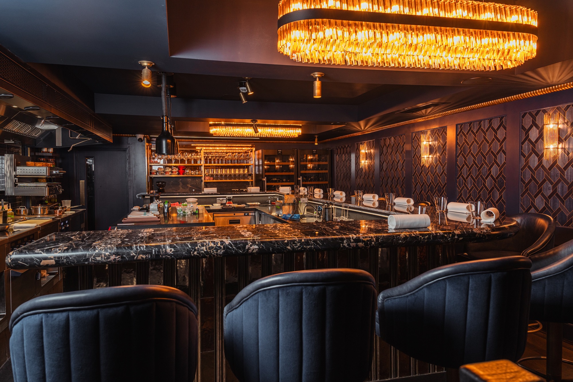 Dressed in deep iridescent blues and golds with Philip Jeffries geometric wallpaper, aged brass wall sconces and statement amber glass pendants, the space centres around a dramatic 14-cover horseshoe-shaped Nero Portoro black marble counter. Here, diners watch Carlo and his team at work, creating a rare and unfiltered connection between chef and guest.