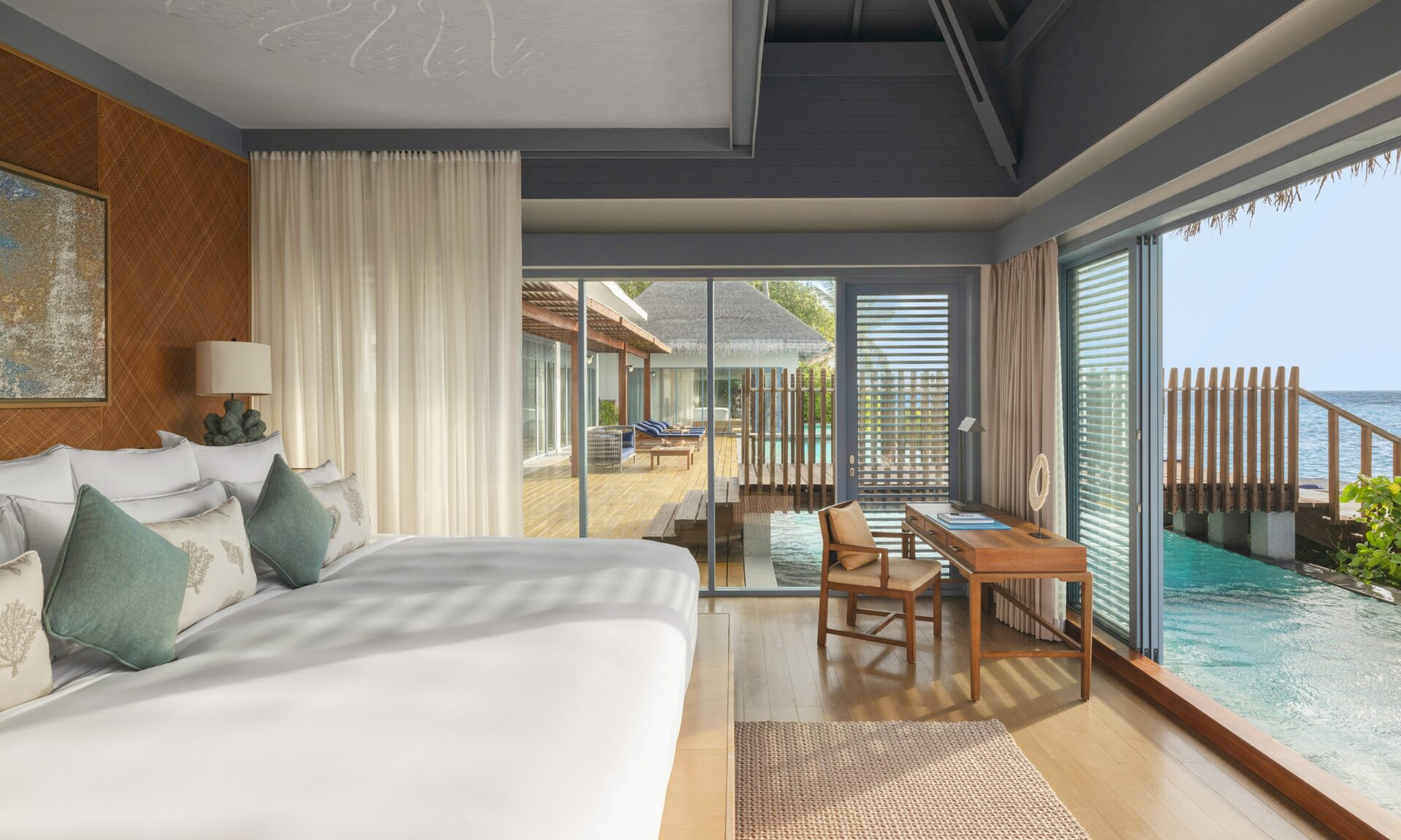 The resort features 38 villas ranging from 220 to 1,250 square metres, each with private pools. Accommodation options include island and overwater villas, two-bedroom ocean villas and a three-bedroom Halcyon Grand Estate.