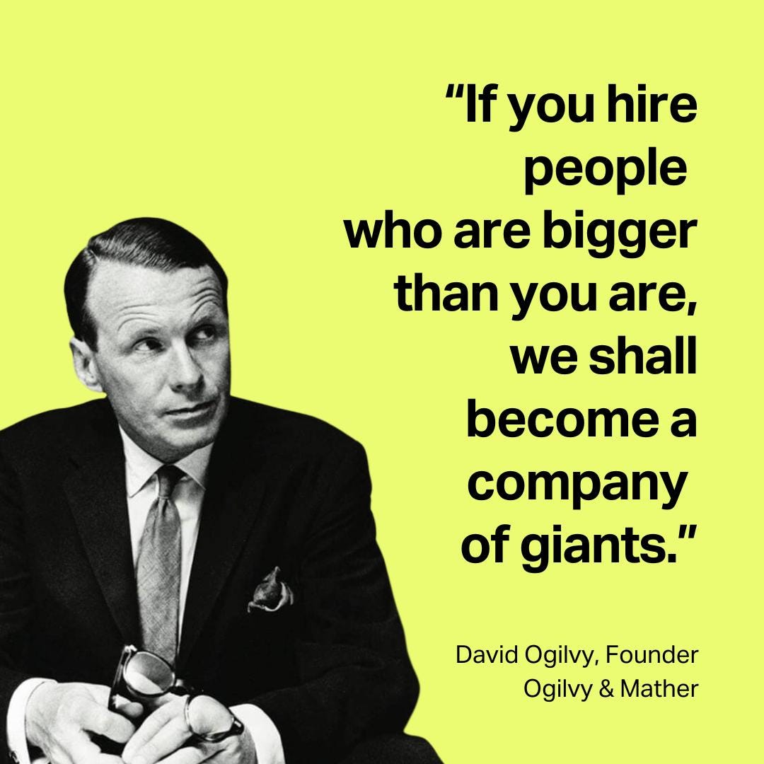 David Ogilvy had a nice quote on this: “If each of us hires people who are smaller than we are, we shall become a company of dwarfs. But if each of us hires people who are bigger than we are, we shall become a company of giants.” It’s a powerful image. But what does “bigger” mean in the real world?