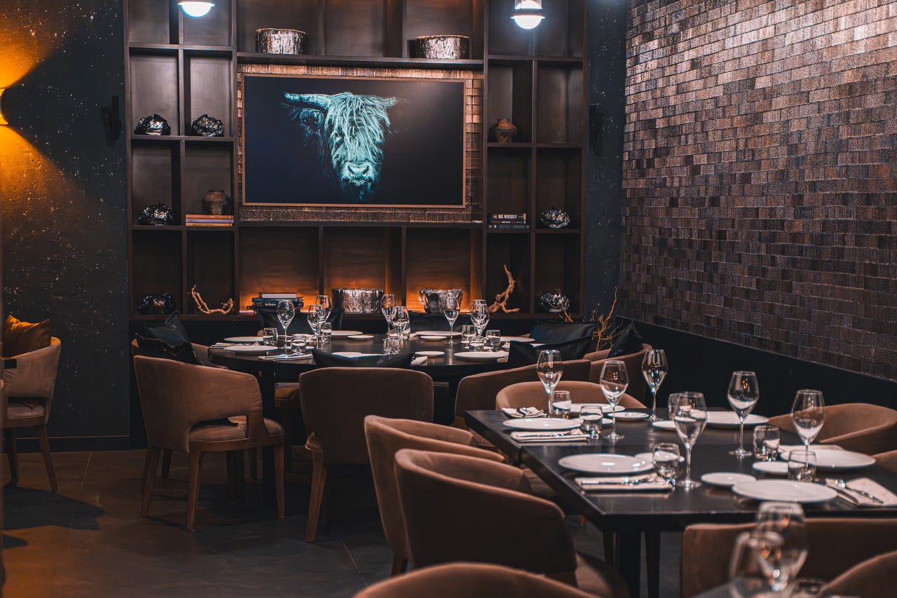 The stars are the steaks, cooked over fire and available in a variety of cuts, including filets, bone-in rib eyes, a porterhouse, and a 36-ounce tomahawk. Diners can choose from six accompaniments, including chimichurri, truffle butter, and habanero chile sauce.