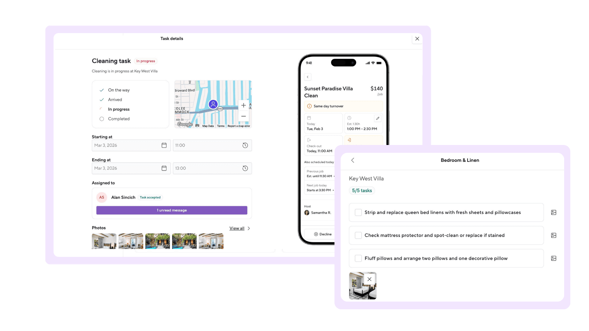 Hosts and service providers can now communicate directly within the platform, replacing fragmented text messages and emails with time-stamped, centralized messaging. Automated reminders prevent missed jobs, while real-time status updates allow service teams to mark tasks as on the way, in progress, or complete, giving hosts immediate visibility without manual follow-up.